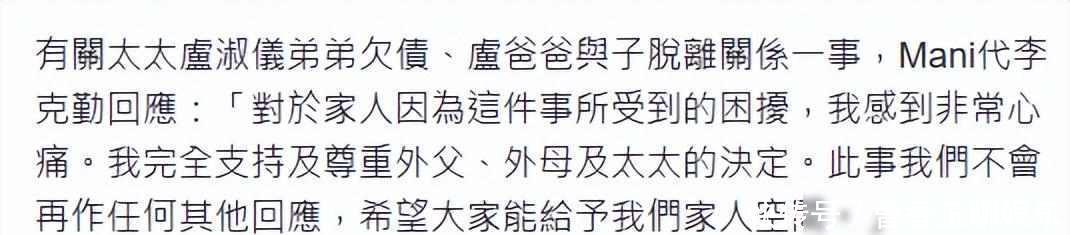 李克勤岳父断亲,债务压垮亲情,沉默是最后防线2025年11月12日,李克勤的岳父卢国辉发表声明,宣布与二儿子卢煜培断绝关系,从当天起,卢煜培所欠债务及个人行为,均与卢国辉及其家人无关,消息一经传出,引发香港媒体广泛关注,记者纷纷追问事件细节。